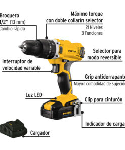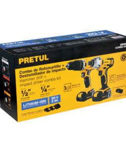El combo PRETUL 20V incluye un rotomartillo inalámbrico y un destornillador de impacto, ideales para trabajos de perforación, fijación y ensamble en construcción, carpintería y mantenimiento.